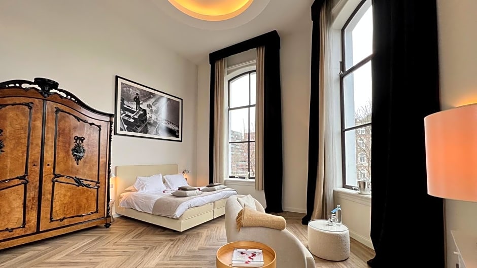 This very spacious suite has a luxurious bathroom with a bath placed in front of the window which features scenic Rotterdam skyline views. They include free water and tea and coffee making facilities. Each suite also features one of the following: